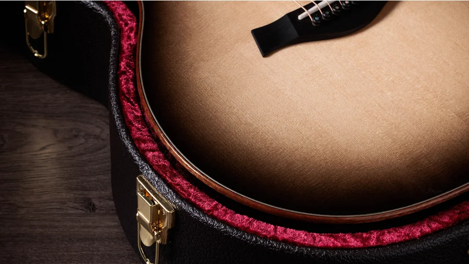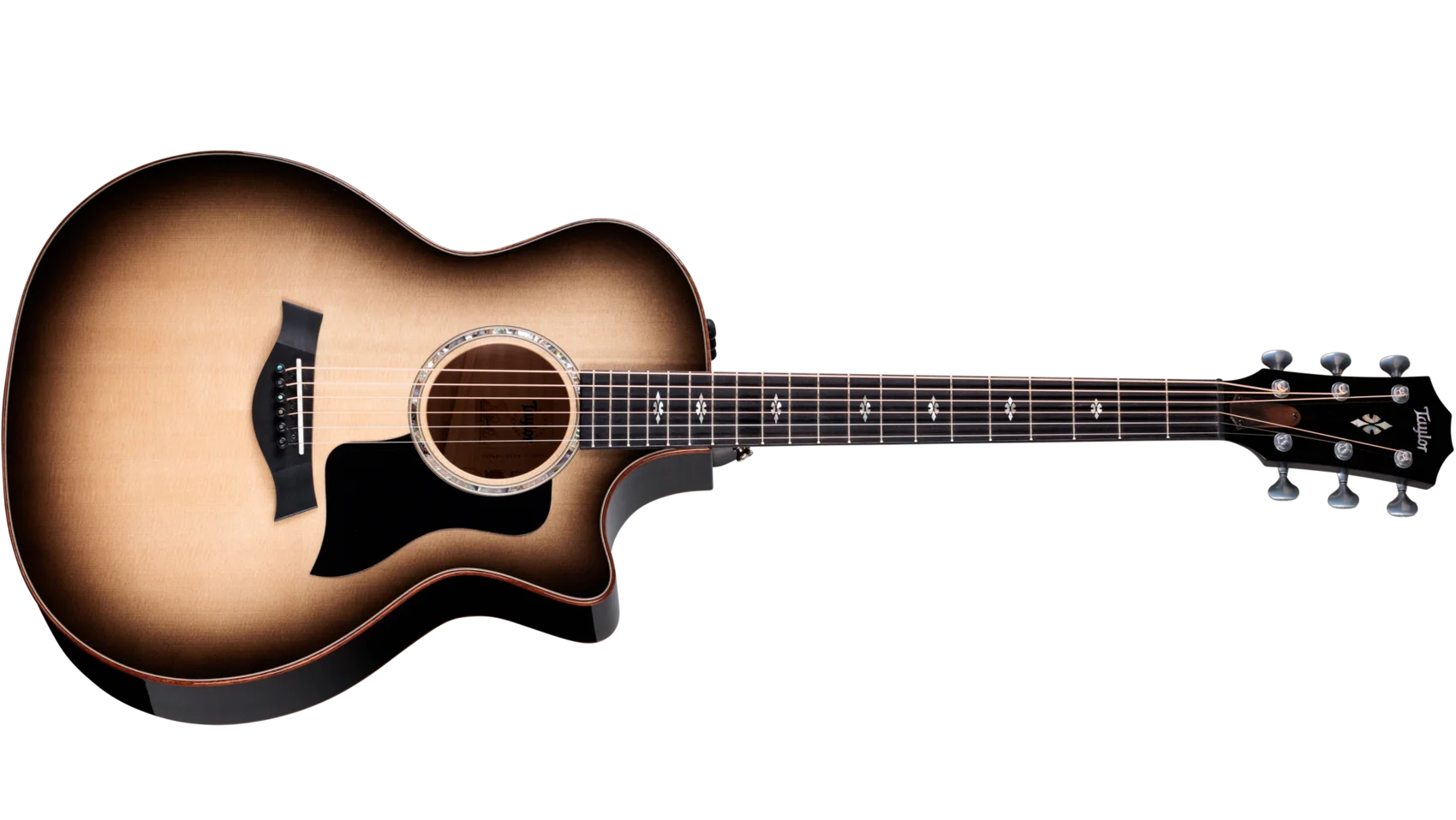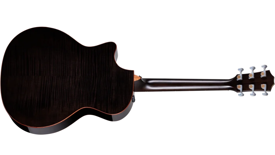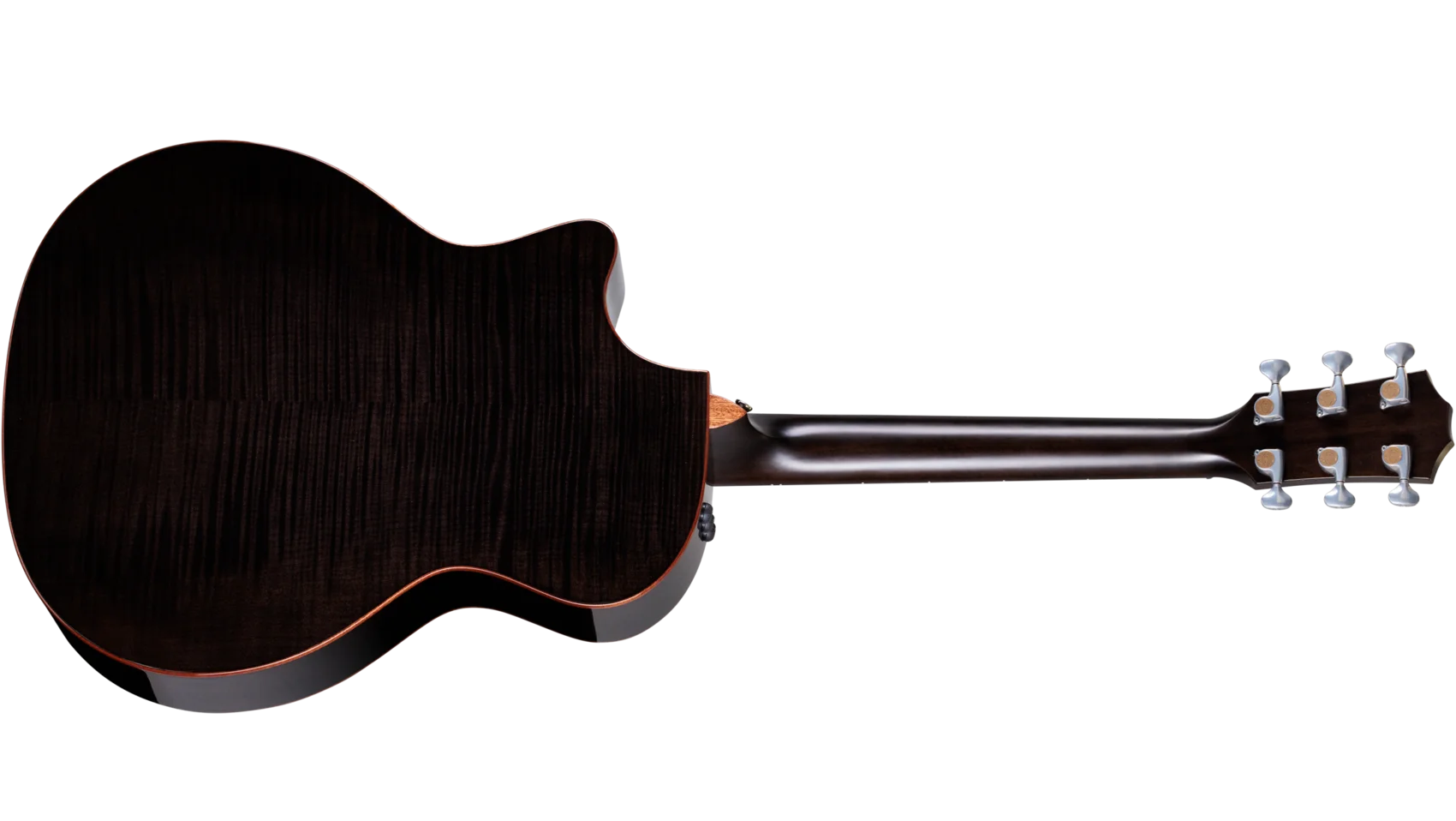 A charcoal edgeburst spruce top is one of several striking aesthetic touches on this cutaway Grand Auditorium 614ce Special Edition. The body’s figured maple back and sides sport a glossy, transparent light black color finish that reveals the figure in a subtle way and transitions smoothly into the top’s dusky edgeburst. Richly grained sapele binding adds a woody visual counterpoint. Tonally, the maple/spruce tonewood pairing yields a clear, balanced voice with a pleasing blend of brightness and warmth and responds well to a player’s touch. Voiced with Taylor’s V-Class bracing, this guitar will sing beautifully in tune from any fretting position and resonate with impressive sustain. Premium Gotoh 510 tuning machines in antique chrome feature an ultra-precise 21:1 gear ratio for smooth pitch control. Other visual details include a trans light black/ satin-finish neck, pale green abalone “Reflections” fretboard/peghead inlays, a single-ring green abalone rosette, ebony bridge pins with green abalone dots, and a black pickguard. The guitar comes with stage-ready ES2 acoustic electronics and ships in a deluxe hardshell case.