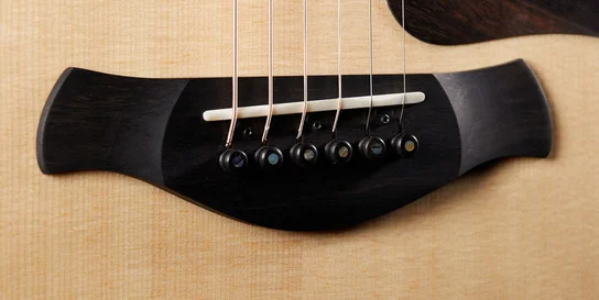 A reshaped West African ebony bridge updates the elegant Taylor bridge with contoured edges that soften the feel against your picking hand.