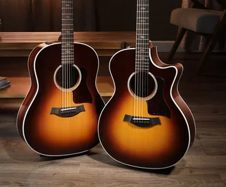 Blending an all-star tonewood pairing with striking visual appointments, the Taylor 400 Series offers a broad range of musical utility for working musicians of all stripes. Models feature solid Indian rosewood backs and sides paired with solid Sitka spruce tops, yielding a warm low-end character, clear trebles and a slightly scooped midrange that’s ideal for playing in arrangements with vocals or other instruments. V-Class bracing inside dials up the response with louder volume, longer sustain and greater harmony between notes, drawing out more of the rich overtone character that players love in the rosewood/spruce combo. Sunburst top finishes highlight the visual package for a stage-ready presence that’s not too precious for everyday use, while the built-in ES2 electronics offer faithful plugged-in tone for amplified scenarios. Whichever model you choose, you’re sure to find a reliable partner for all your musical pursuits.