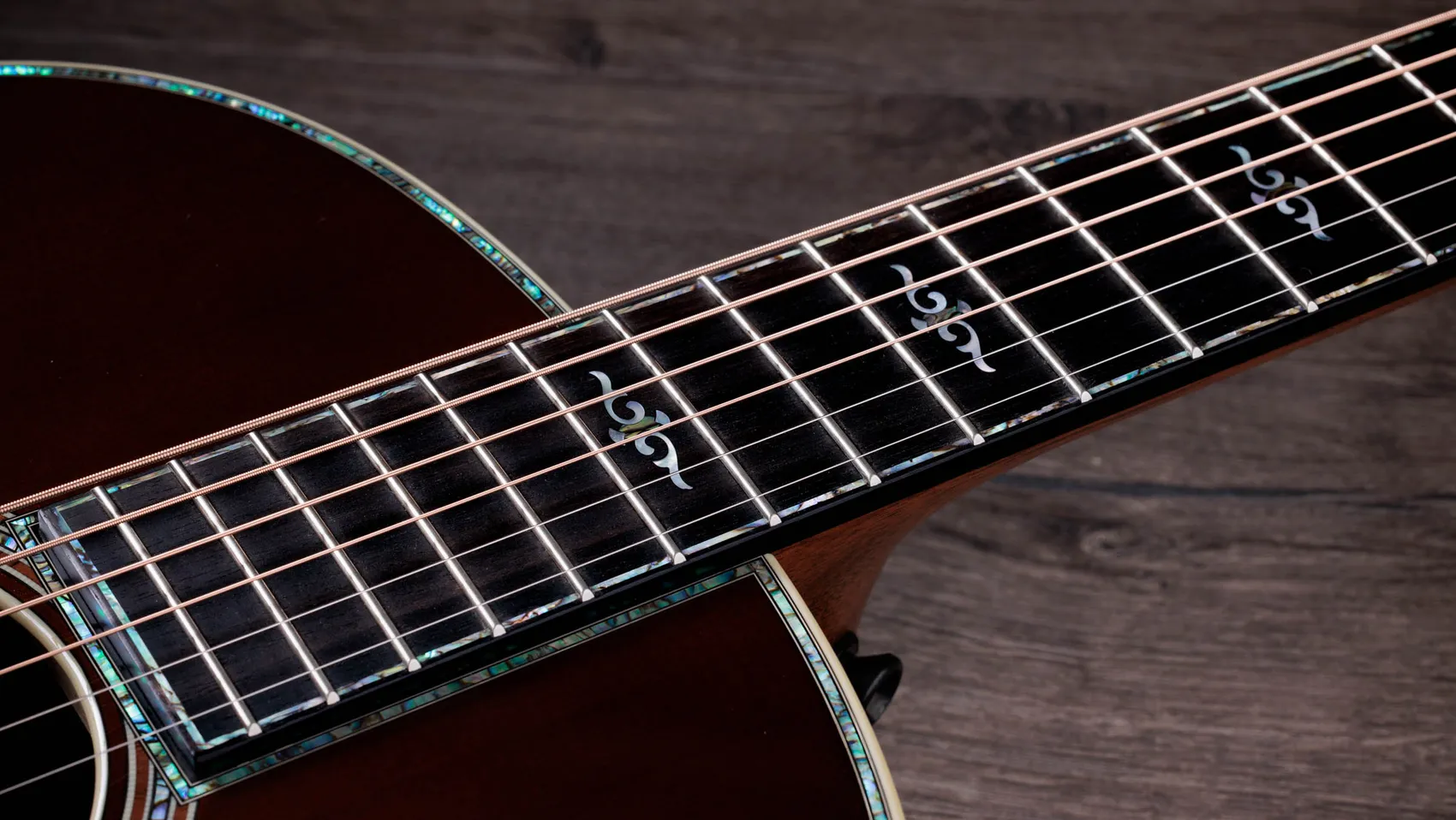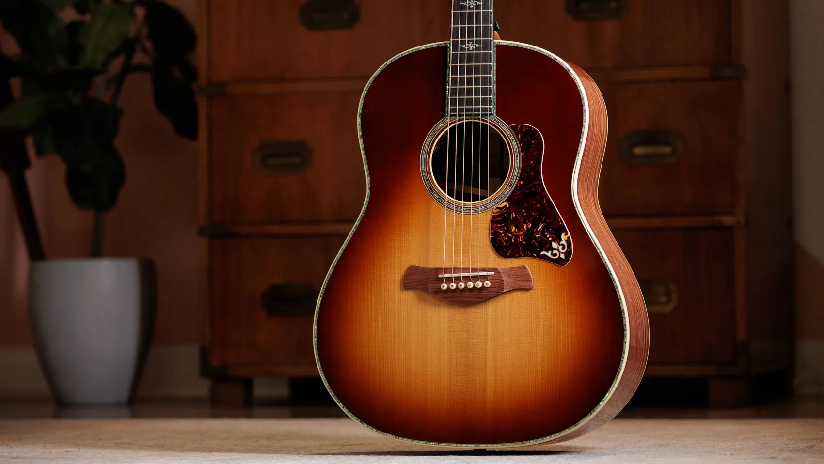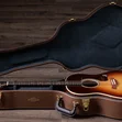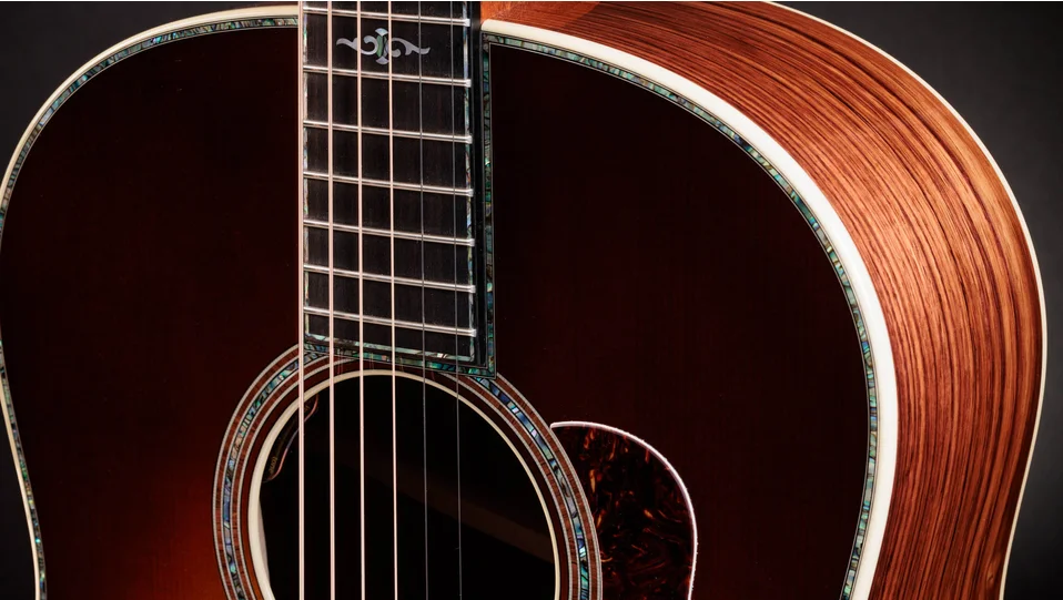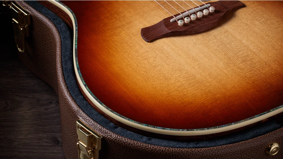 Other aesthetic touches include a golden-brown “Teardrop Sunburst” top, a full-body gloss finish, new paua/mother-of-pearl Continental Deluxe inlays, a single-ring paua/Honduran rosewood rosette, a Honduran rosewood curve wing bridge, Indian rosewood bridge pins, grained ivoroid binding, and paua fretboard and top purfling. Equipped with LR Baggs Element VTC electronics and Gotoh 510 antique gold tuners with ebony buttons, this model comes in a deluxe hardshell case with a British Cocoa exterior.