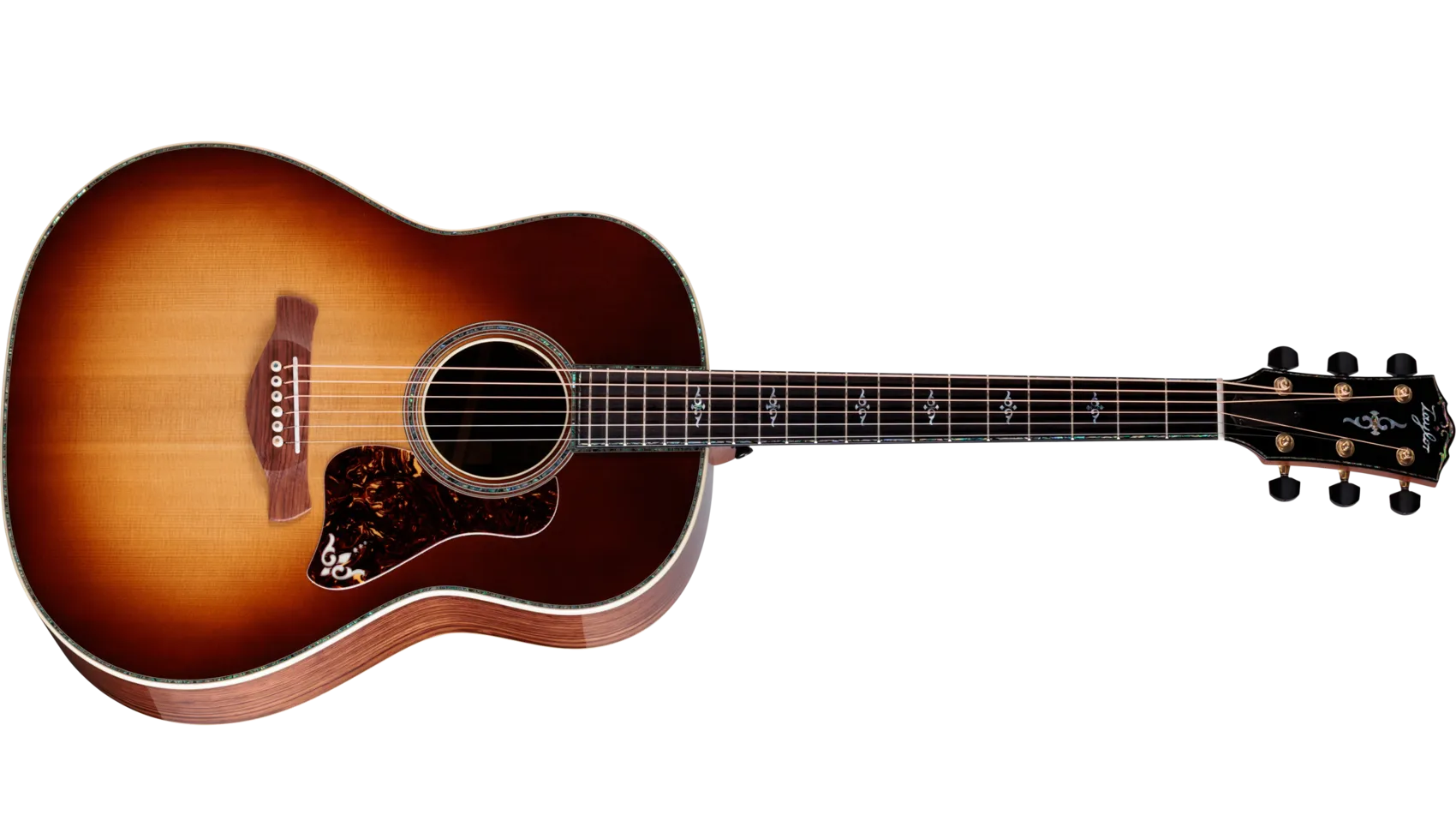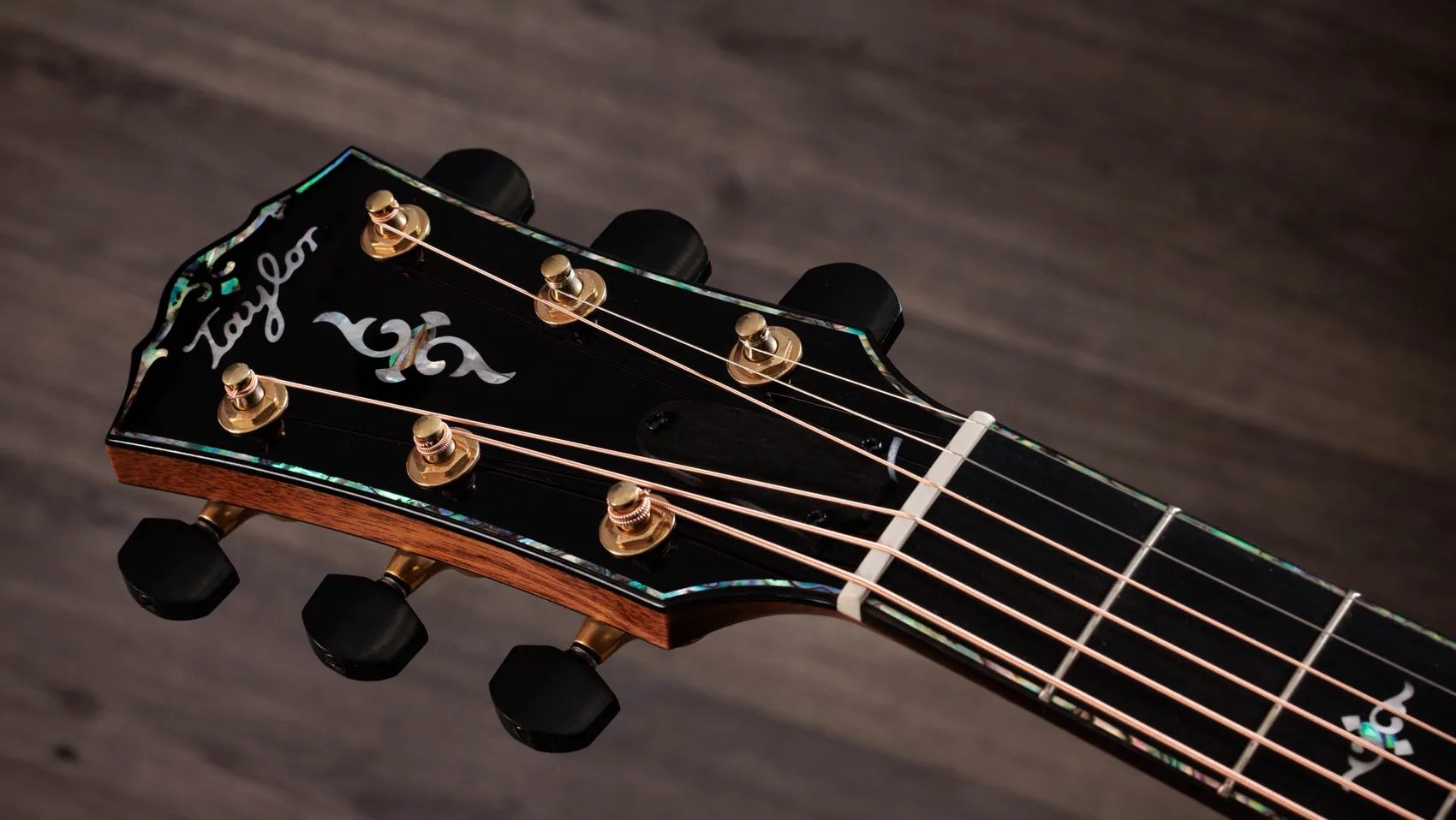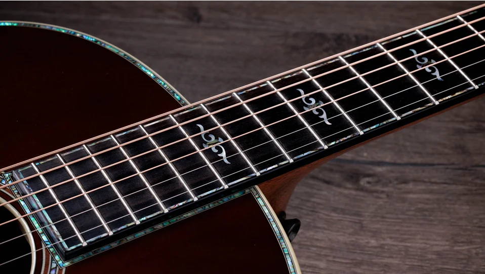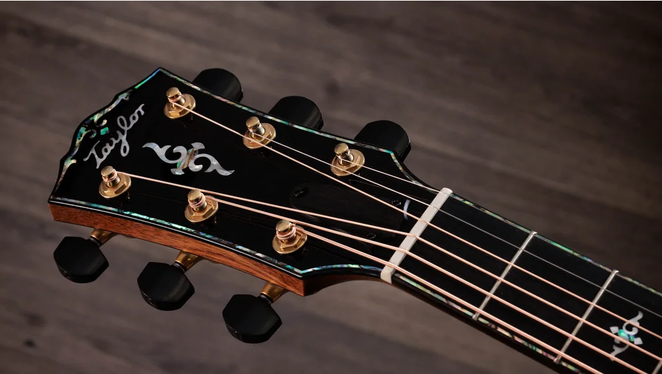 Fanned V-Class® interior bracing—applied with hot hide glue—enhances low-end resonance, projection, sustain and harmonic agreement between notes along the entire fretboard. A slender, long-tenon Action Control Neck™ dials up even more resonance while allowing for quick, easy string height adjustments. This model features a modified peghead shape with an angled-back design, script-style Taylor logo and paua purfling that culminates in a distinctive visual flourish at its crown.