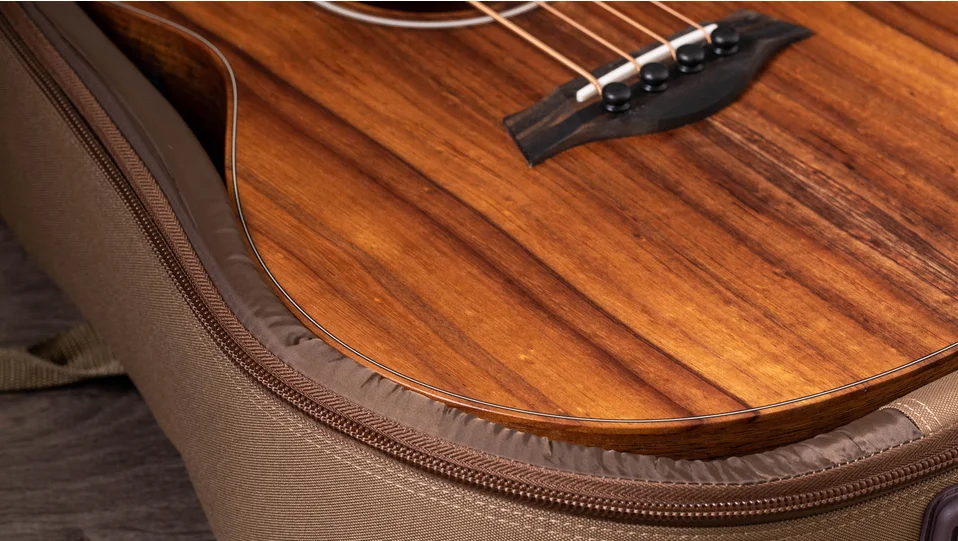 If you're looking for a quick, easy-playing way to add a totally fresh sound to your acoustic toolkit, the GS Mini-e Koa Bass offers a fun take on the acoustic bass guitar sound. Specially formulated nylon-core bass strings (designed by D'Addario specifically for the GS Mini Bass) offer punchy bass tone with a relaxed, slinky feel that goes easy on your hands regardless of your skill level. This model boasts a solid Hawaiian koa top and layered koa back and sides for a warm, snappy sound and beautiful visual character. The GS Mini-e Koa Bass includes built-in ES-B electronics featuring a digital tuner with an easy-to-read LED display and tone controls. This mini guitar ships with a structured gig bag.